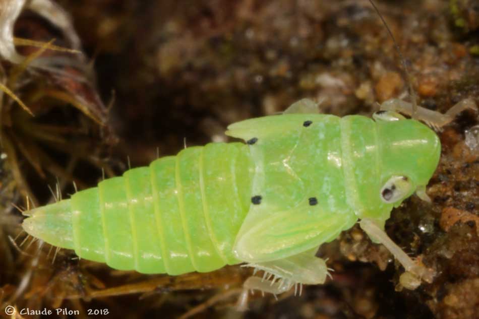 ![]() Une nymphe Neocoelidia tumidifrons. Oman (1949a) note la présence de poils rigides sur les tergites IV à VIII. |