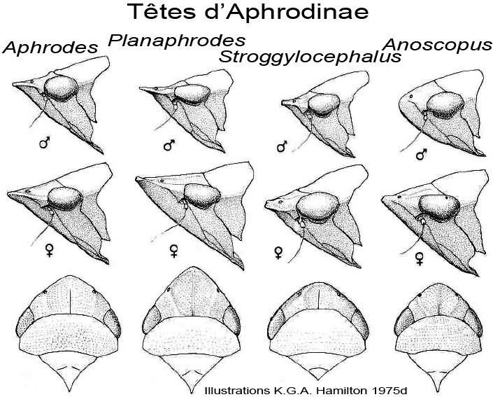 est de l'espèce, c'est une autre histoire. Aphrodes Ressemble à Stroggylocephalus mais le vertex est plus long, et sa marge antérieure est plus accentuée. Planaphrodes Vertex horizontal et long. Stroggylocephalus Vertex plus court et large. Anascopus Vu de profil, vertex du mâle courbé. Femelles très différentes. ![]() ![]() |