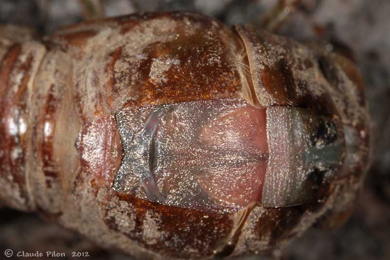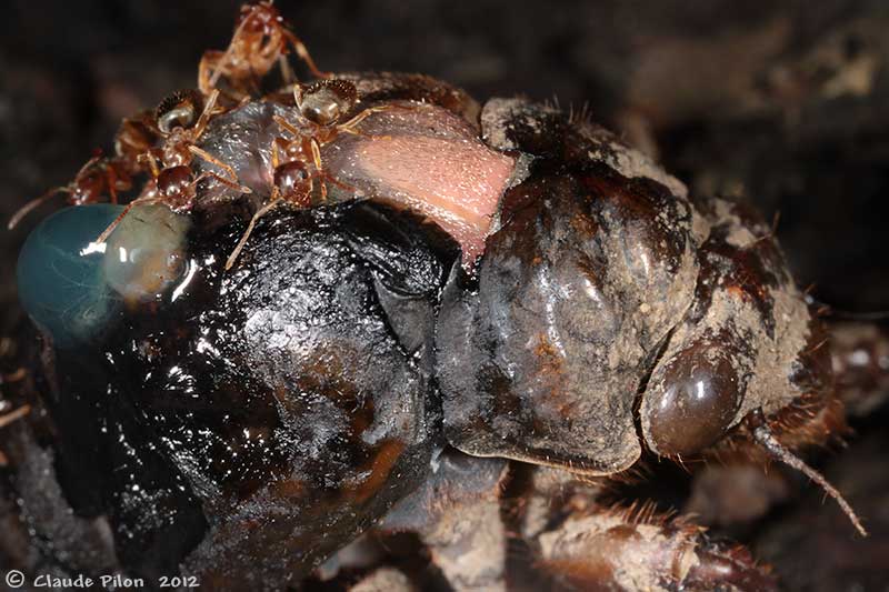 les fourmis prélèvent du liquide qui s'échappe de l'exuvie entrouverte.