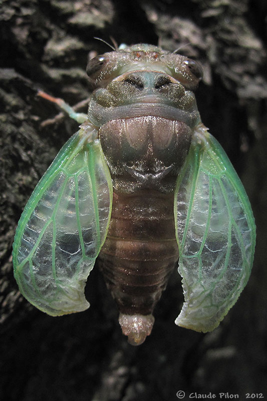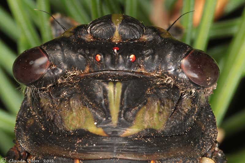 épinette, la cigale grimpe le long du tronc et s'y fixe solidement pour