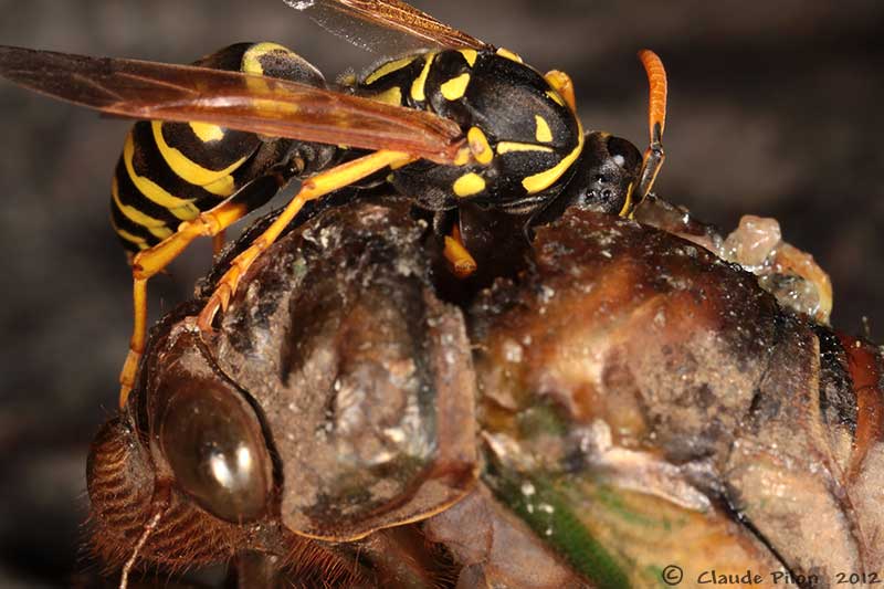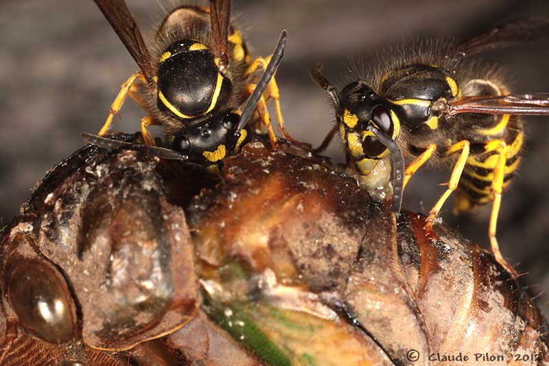 Au centre et à droite, des guêpes découpent la cigale et emportent la