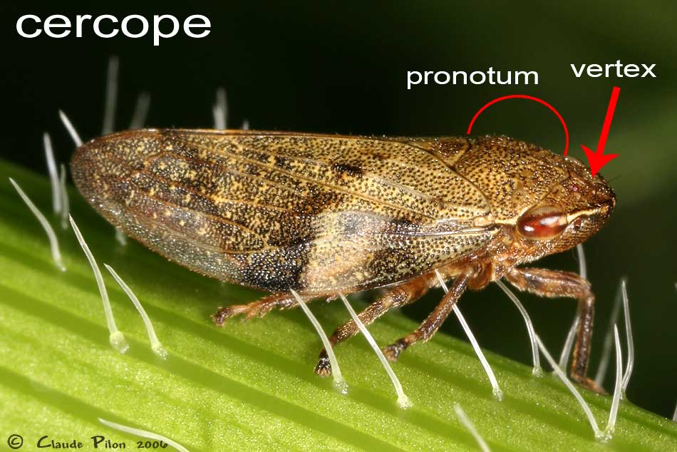 ![]() Ci-dessus, un membracide du genre Stictocephala. Le casque s'étend à partir du vertex, vers l'arrière en couvrant l'abdomen et presque toutes les ailes. Les insectes des autres familles d'Hémiptères, comme ce cercope ci-dessous, n'ont pas de casque. Un pronotum court est situé à l'arrière du vertex. ![]() Ci-dessus, pour comparer, un cercope sans le casque des membracides. ![]() Enchenopa latipes porte une longue corne au-dessus de la tête. Celle des mâles est plus courte que celle des femelles. ![]() Sur du chêne, une nymphe émerge de son exuvie. Ce n'est pas sa dernière mue. En effet, la présence de fourreaux alaires où sont encore en développement les futures ailes, permet de conclure qu'il s'agit d'un immature. Les nymphes membracides muent cinq fois avant d'atteindre l'âge adulte. ![]() Une femelle Stictocephala sp. insère son ovipositeur et pond sous l'écorce d'une petite branche de saule. |