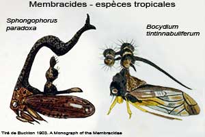 ![]() ![]() Ci-dessus, Telamona tristis. La nymphe vient juste de muer au stade adulte. Son casque est encore plié. Cliquez sur la photo pour voir le casque déployé, 13 minutes plus tard. ![]() Les nymphes se distinguent de celles appartenant aux familles qui leur sont apparentées. Ci-dessus, une nymphe Stictocephala taurina. Le segment IX de l'abdomen se prolonge à l'arrière et forme un tube allongé, caractéristique des membracides. ![]() Smilia camelus ![]() Entylia carinata auprès de ses oeufs pondus sur la nervure principale d'une plante herbacée. Les fourmis s'affairent autour du membracide. ![]() Mue imaginale de Stictocephala sp. |