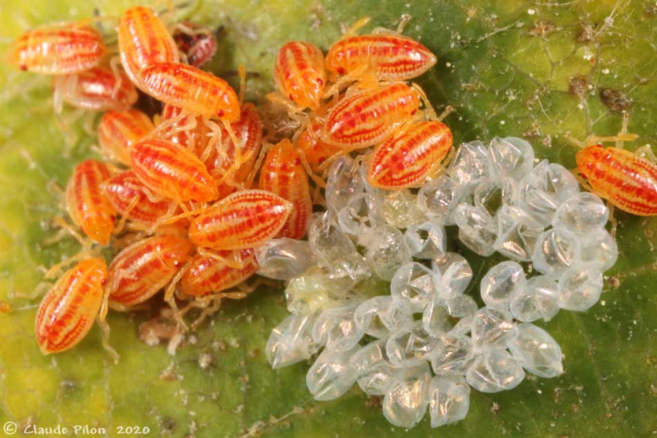 l'enveloppe des oeufs non éclos (→). Les nymphes sont mobiles