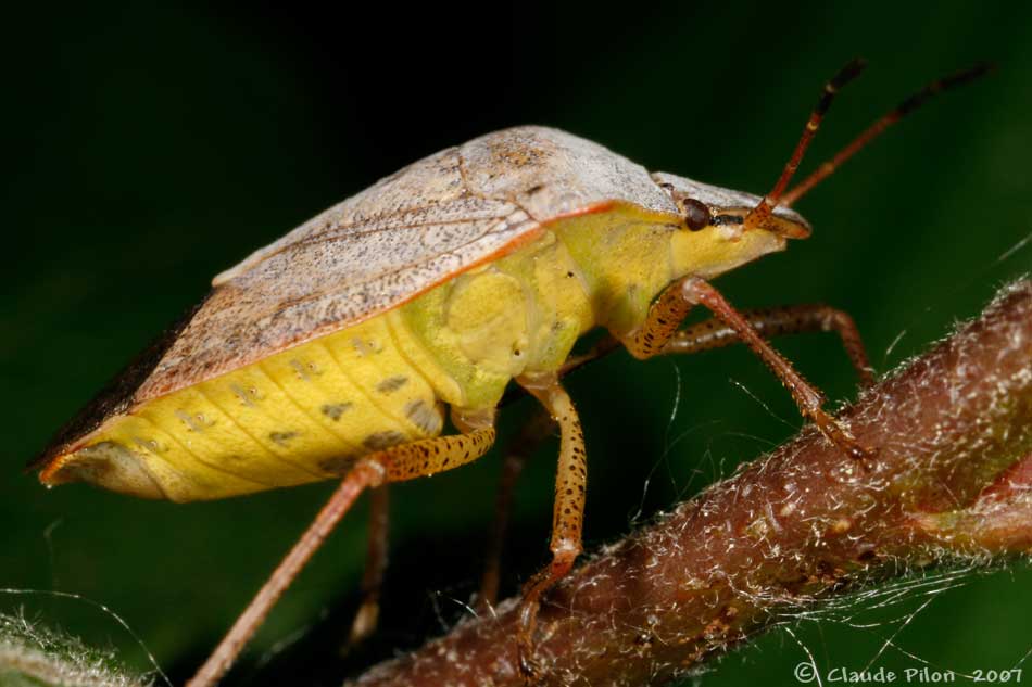 | Un 25 juin, les oeufs d'une punaise, déposés sur la surface duveteuse du fruit d'un Silène blanc (Silene latifolia), ont éclos. L'observation sur le site dure jusqu'au 30 juin, date à laquelle un seul individu, de stade II est prélevé et gardé en captivité jusqu'au stade adulte, un mois plus tard. Il sera ramené, le lendemain de la mue finale, sur le lieu de sa capture. Les durées respectives de développement ont été, pour les 5 stades de 4, 5, 5, 7 et 9 jours. Ces données correspondent bien à celles observées par Rolston & Kendrick (1961). Plusieurs végétaux frais ont été offerts à la nymphe. Elle a préféré les gousses de Moutarde des champs. Le feuillage des têtes de verge d'or a été utilisé comme nourriture mais était surtout apprécié comme refuge pour se dissimuler. | ||