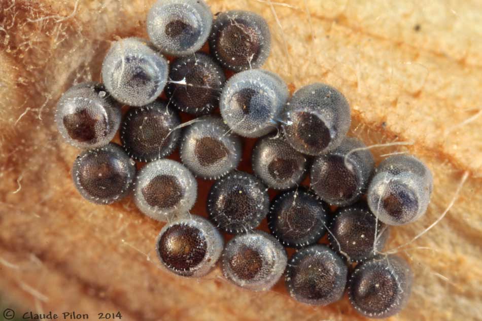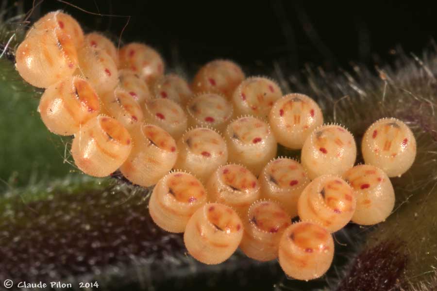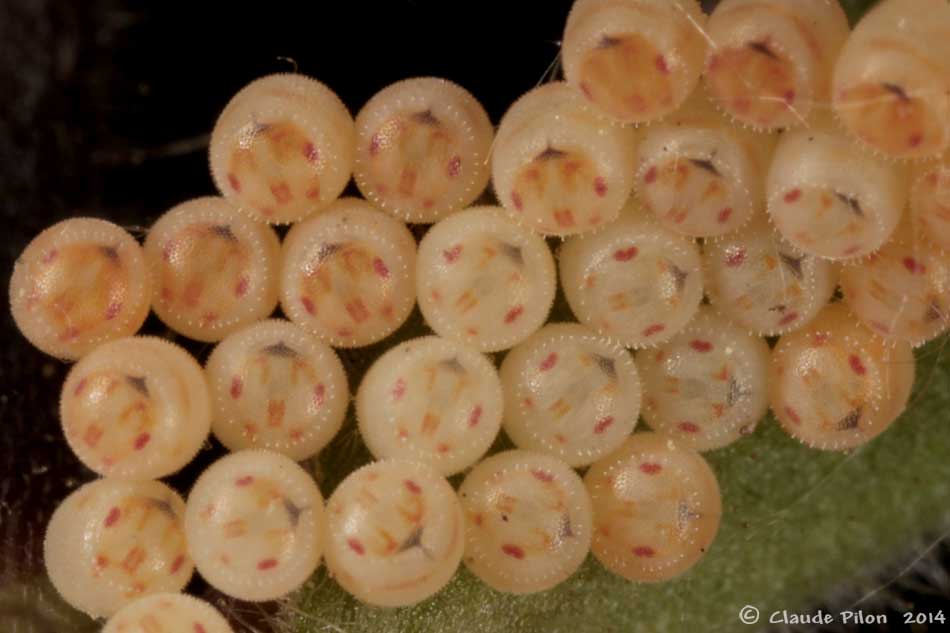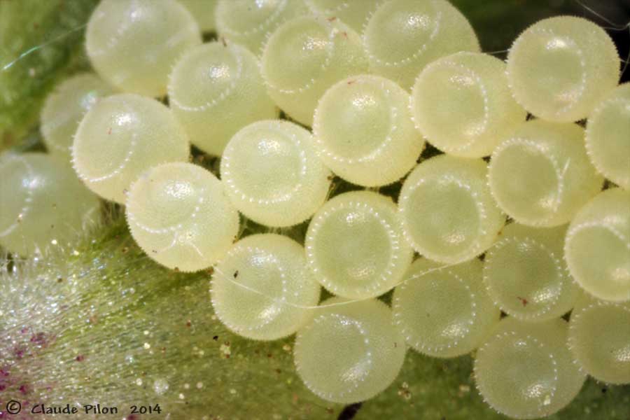 | À l'été 2014, plusieurs masses d'oeufs ont été observées sur le fruit du Silène blanc. Les observations qui suivent en ont été tirées. Six des huit masses d'oeufs en comptaient 28, une 27 et une autre, 21 oeufs. Le nombre de rangées variait entre quatre à sept avec une plus grande fréquence de cinq rangées d'oeufs. | ||