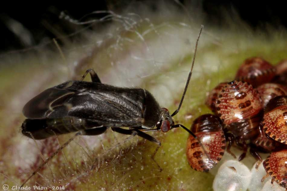 | Pendant une douzaine de minutes, ce Miridae occasionnellement zoophage (probablement Plagiognathus politus) tourne autour des jeunes punaises. Il donne un coup de rostre à une nymphe qui frétille. Le Miridae n'insiste pas et s'éloigne. | Les nymphes étaient encore regroupées sur la masse d'oeufs éclos. Soudain, un adulte de la même espèce se présente et marche sur les jeunes qui s'affolent. L'adulte cherchait peut-être un site de ponte. La nymphe de stade I est à peine plus grande que les tarses de l'adulte. Dans un mois à peine, elle aura pourtant atteint la taille de cet adulte! | Durant le premier stade et le début du second stade de croissance, les nymphes sont grégaires et restent très étroitement groupées. Elles se dispersent ensuite. Ici, non loin de leur lieu de naissance, trois punaises de stade III sont restées groupées. |