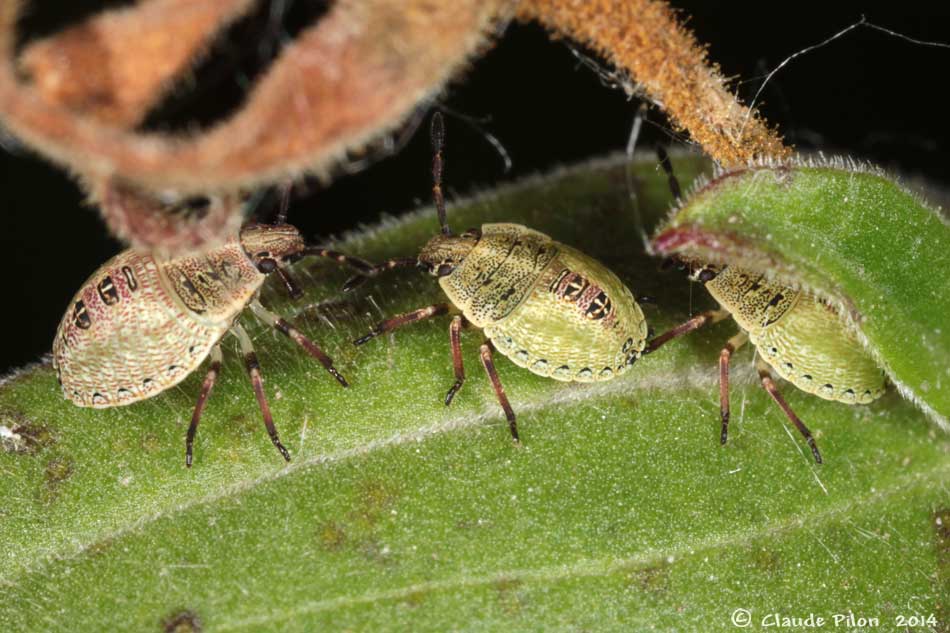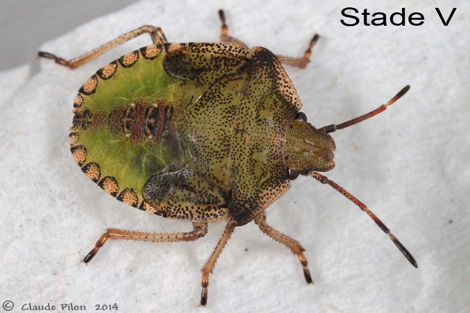 | 5 juillet, en captivité, stade III. Elle a mué la veille. L'observation attentive de la coloration révèle un élément remarquable. La ponctuation dorsale du thorax reste à peu près la même, d'une mue à l'autre. | 13 juillet, en captivité, stade IV. À chacune des mues observées en captivité, la nymphe reste parfaitement immobile, sans apparemment se nourrir 24 heures avant de passer au stade suivant. Elle reste immobile également quelques heures après la mue. | 17 juillet, en captivité, stade V. La nymphe a mué la vieille au stade V. Notez l'évolution des couleurs du même stade, mais 5 jours plus tard (photo suivante). La nymphe Euschistus variolarius élevée par MJ Hatfield est très semblable à celle-ci. Voir sur BugGuide. |