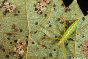 | Les photos 1 à 4 ci-dessous présentent une attaque de Plagiognathus (Miridae: Phylinae) aux dépens de deux Tingidae du genre Corythucha. La scène a duré une minute puis Plagiognathus s'est éclipsée sous la feuille, bredouille. Les Tingidae étaient sur leur hôte, une Astéracée et l'une d'elles était auprès de sa ponte. | ||